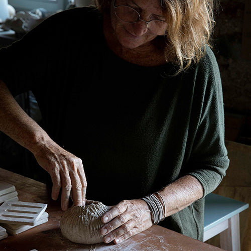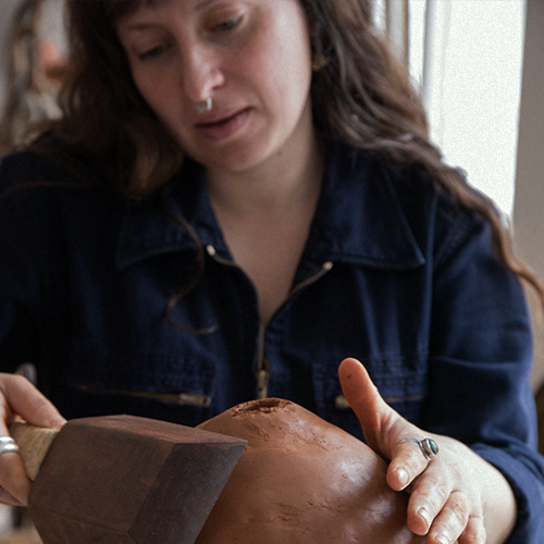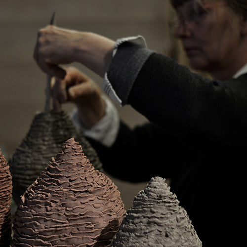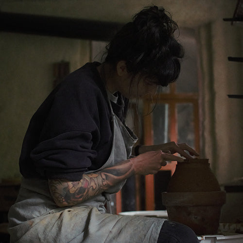 Jesse Donham-Buratti is a ceramist and agroecologist who works with wild materials. She has lived her whole life between two places and two languages, between Italy and California, and after a three-year degree in Environmental and Political Sciences she moved to Melbourne, Australia. Here she began to experiment with clay in a self-taught way, first working on the wheel and then dedicating herself to manual techniques. She discovered and deepened the practice of "wild clay" by training with true pillars of this approach, such as Nina Salsotto Cassina, Anja Slapnicar and Studio Alluvium. «I collect small quantities of clay during excursions, swimming, in agricultural land, and then test them numerous times, adding rocks and minerals to recreate a sort of landscape on each work. My vases are almost always left unglazed to show the essence of the earth, its cracks and lines, and all are fired at high temperatures, to push the materials to their limits, simulating a very long geological process in a few hours. For a long time, ceramics have been relegated to everyday life, to the creation of necessary and functional objects, practiced for millennia without calling it art. When I work, I think above all of the hands of women who over time have shaped, rolled, cut and designed the ceramics that for me are works of art. Each of my vases bears the name of a woman in history, forgotten over time. Working only by hand, each work is unique and impossible to replicate, both because of the manual construction process and the limited amount of clay that can be collected in each place».